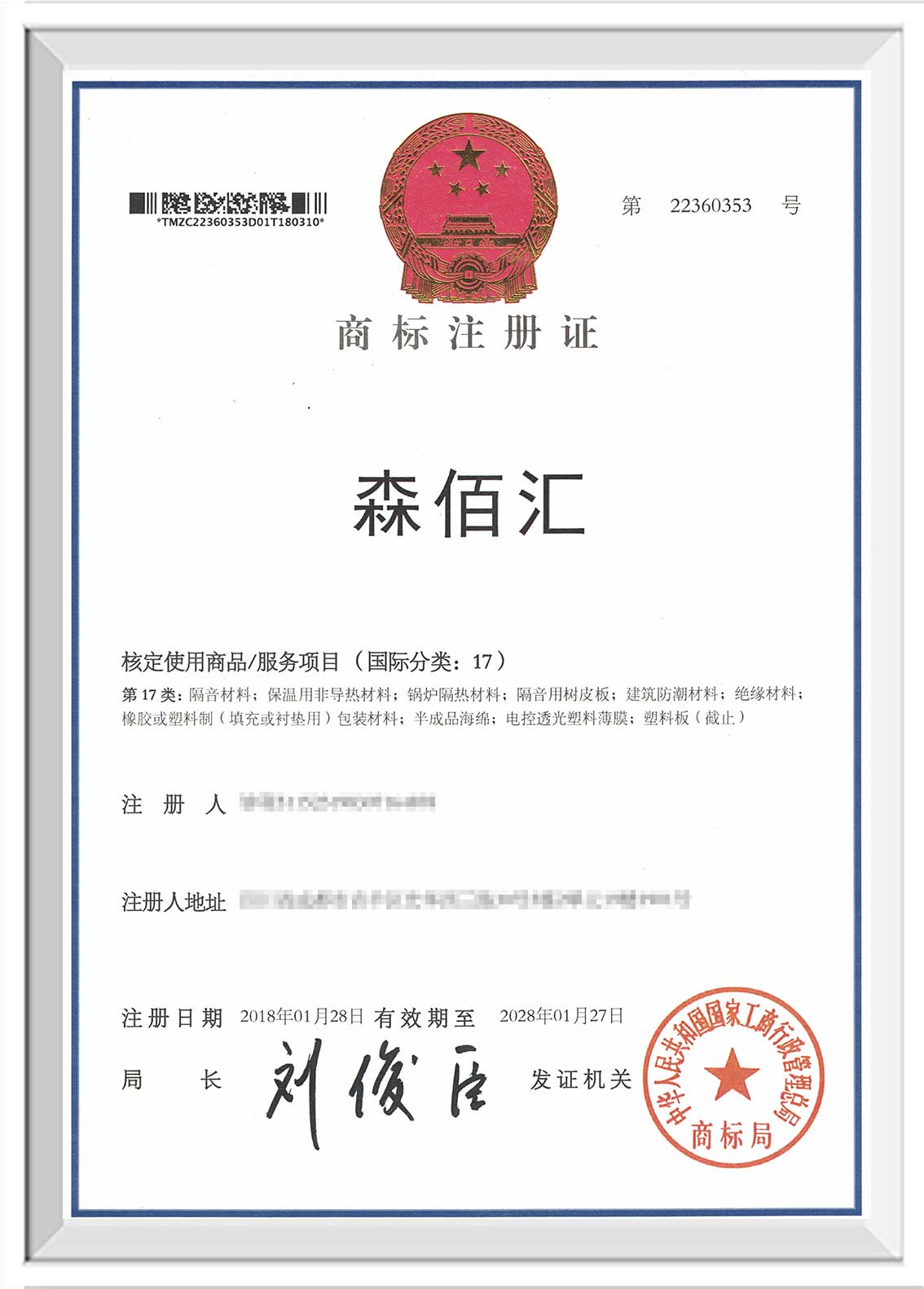 保定“森佰汇”商标证书下发至企业